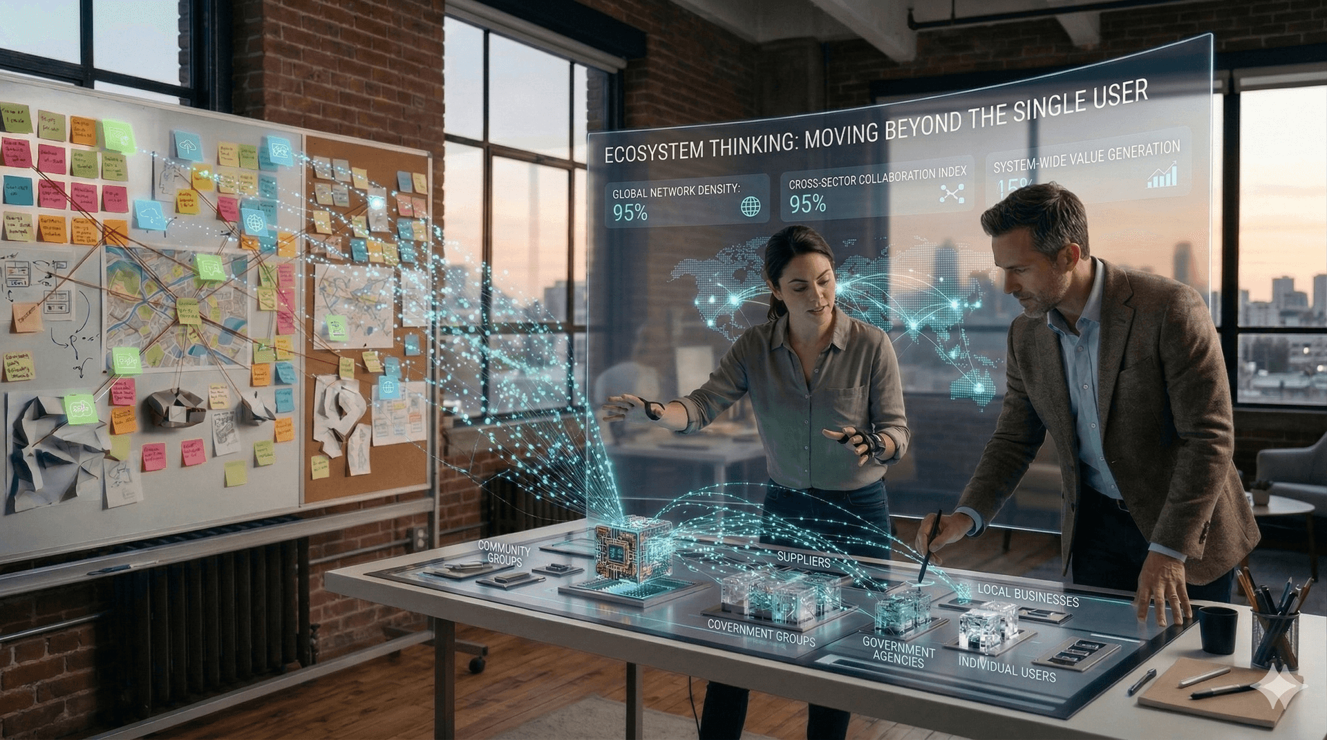 Perhaps the most consequential evolution shown in the infographic is the shift from single-user optimization to multi-stakeholder ecosystem thinking. The traditional design challenge was understanding one person's journey. The modern challenge is orchestrating value across partners, communities, regulators, and environments simultaneously.