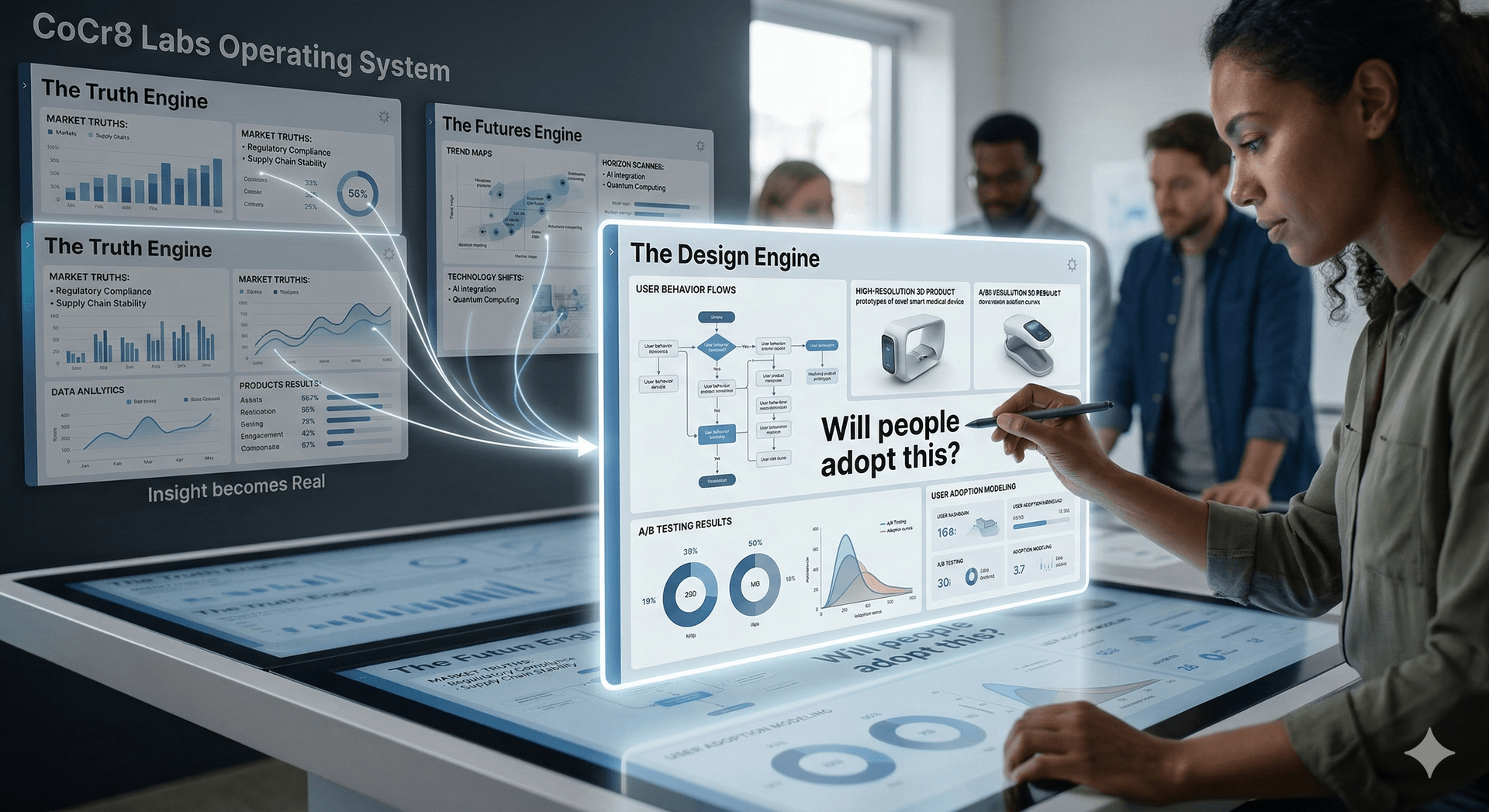 Within the CoCr8 Labs Operating System, the Design Engine represents the third and final dimension, the place where truth and foresight become tangible.