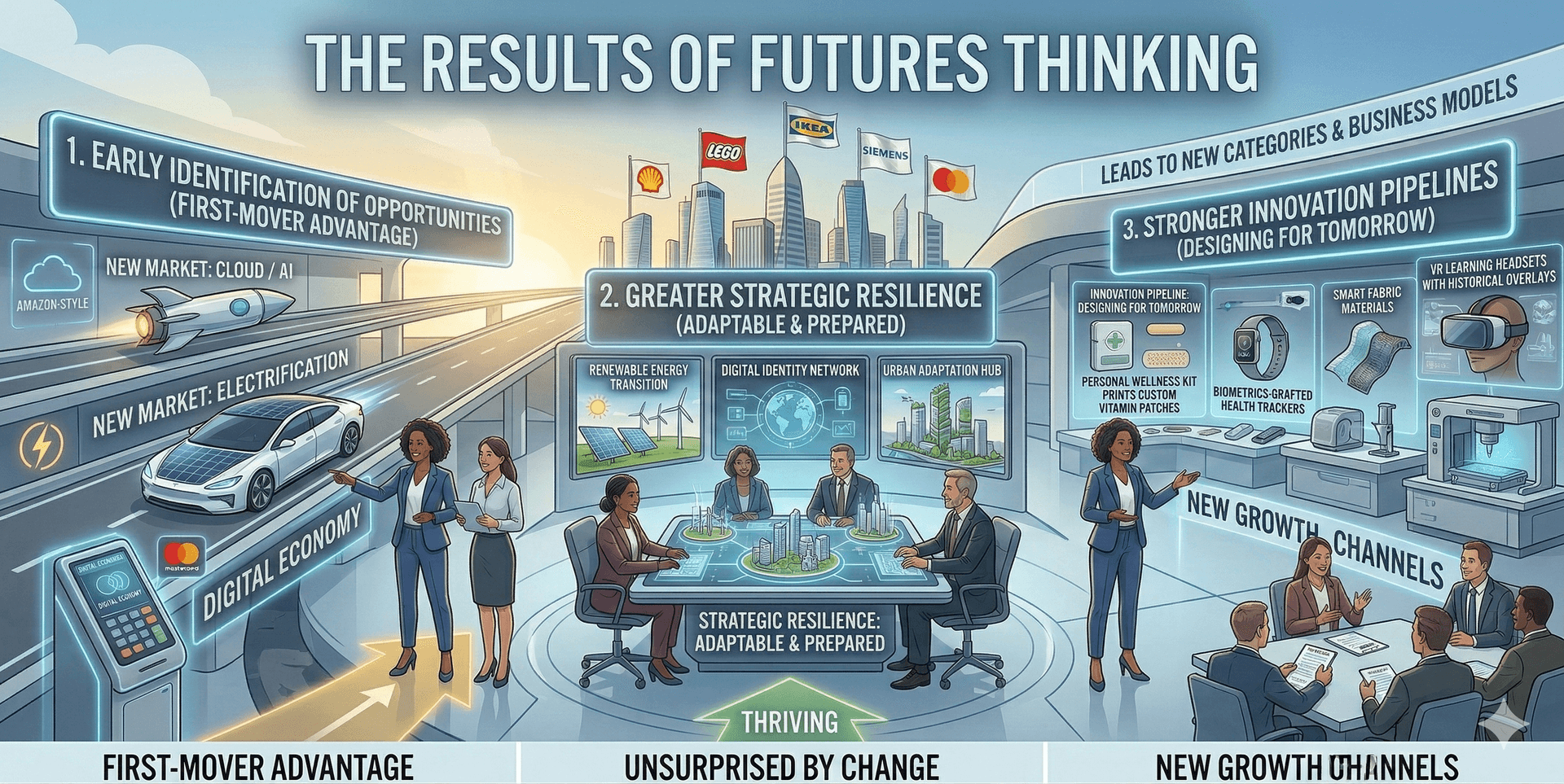 Companies like Shell, Siemens, IKEA, Mastercard, and LEGO have embedded futures thinking into their strategy and innovation processes. The result is a consistent ability to identify opportunities early, navigate disruption, and create entirely new markets.